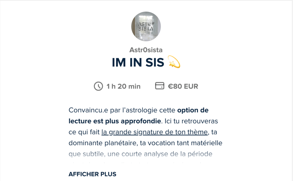 Mon procédé: Après avoir pris rendez-vous sur Calendly ou bien répondu au formulaire de contact pour plus d’informations, deux options te seront proposées: un rendez vous en visio ou un audio avec ta lecture